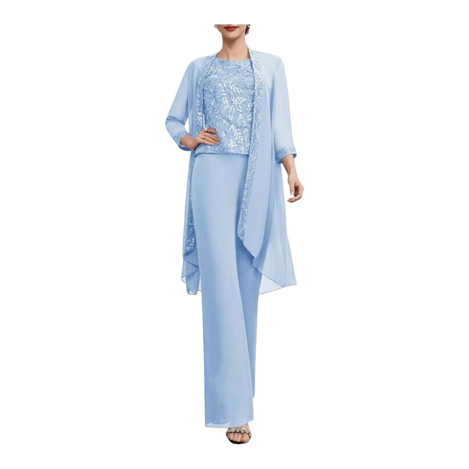 Chic light blue three-piece set with intricate detailing. Perfect for formal occasions.