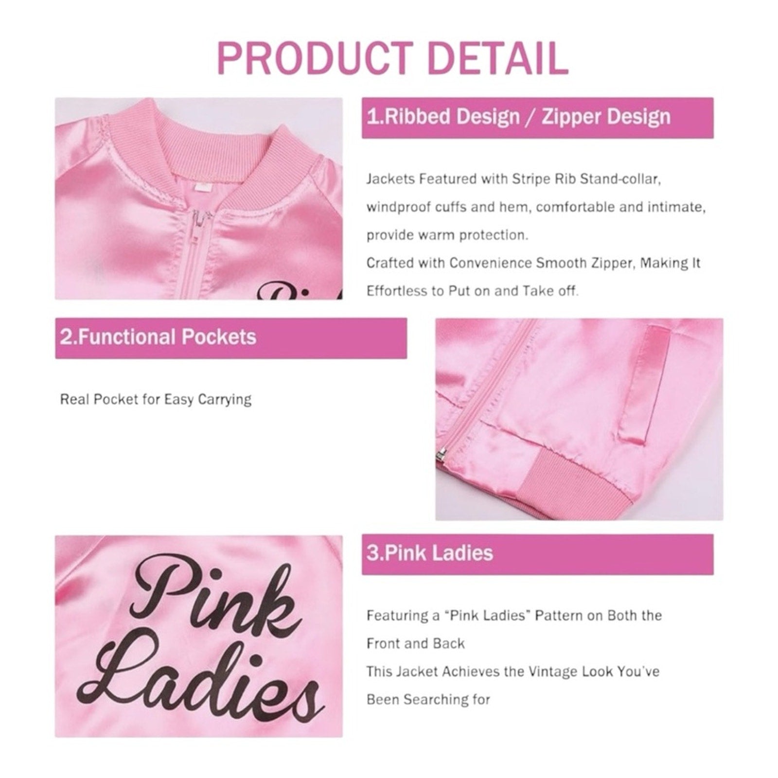 Pink satin jacket with 'Pink Ladies' logo. Includes black and pink glasses, black dot headband, black dot scarf, pink solid scarf, and earrings.